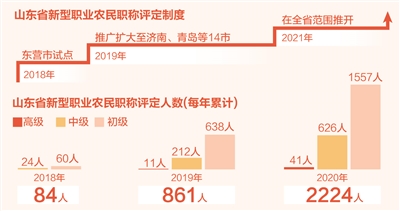 自2018年起,山東率先在東營試點新型職業(yè)農(nóng)民職稱評定制度,為鄉(xiāng)村振興選拔培育了一批有技術(shù)、懂市場、會經(jīng)營、善開拓的鄉(xiāng)村專業(yè)人才。2021年在前期試點工作的基礎(chǔ)上,山東面向全省推開這一制度。截至2020年底,山東已評定新型職業(yè)農(nóng)民職稱2224人,其中高級職稱41人、中級職稱626人、初級職稱1557人,為鄉(xiāng)村振興提供了人才支撐。