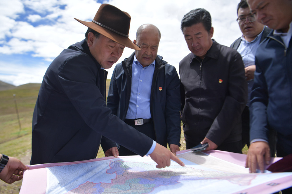 張曉軍(左一)正在視察。果洛州委宣傳部供圖