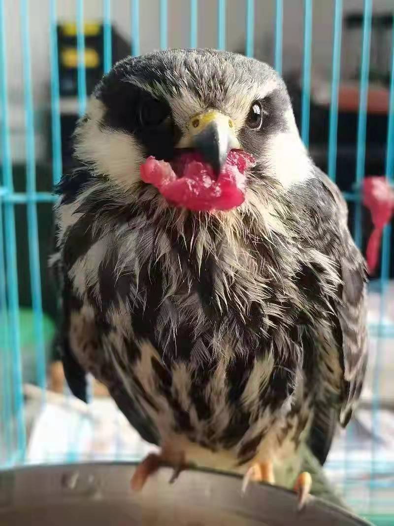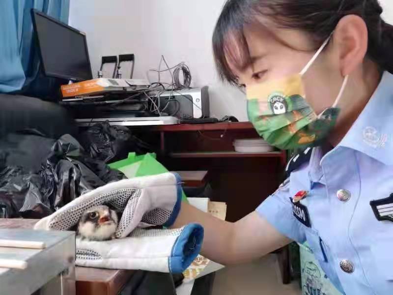 民警正在照料阿穆爾隼。茫崖市公安局森林警察大隊(duì)供圖