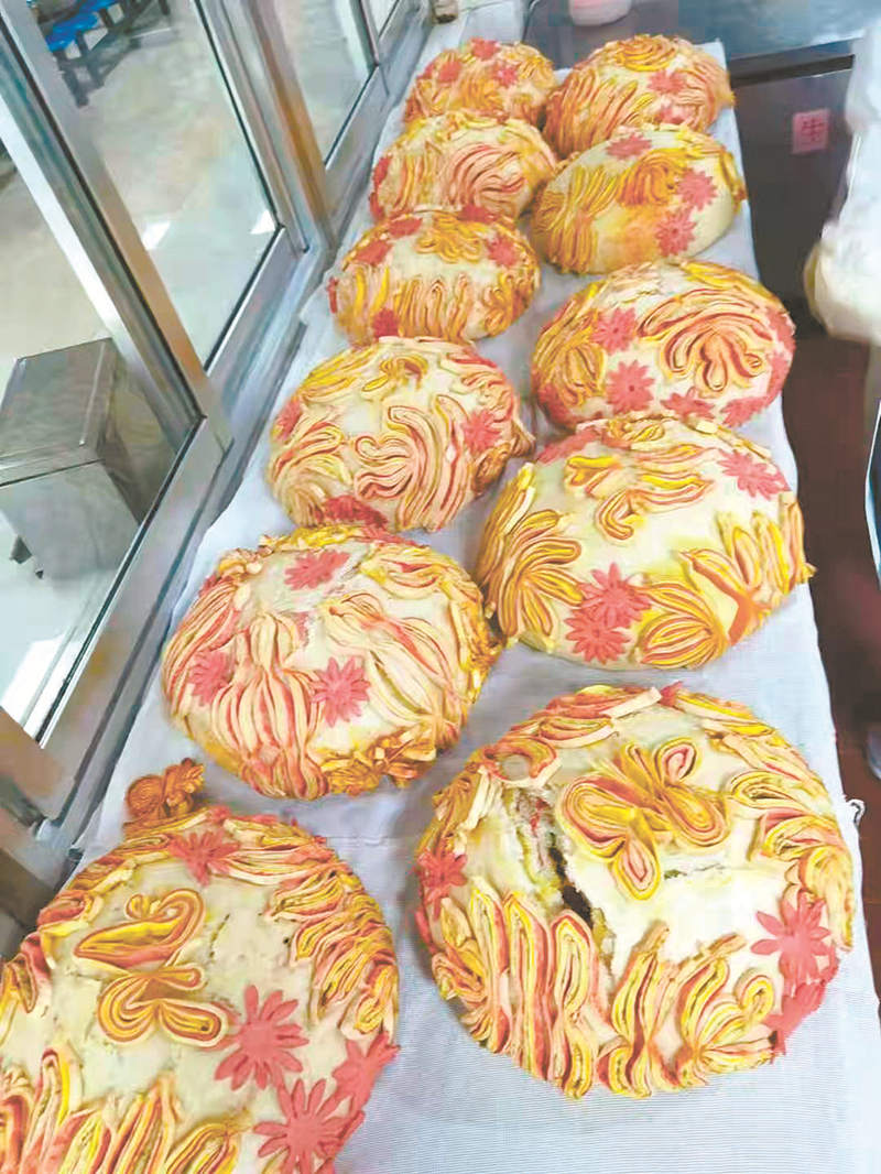 “經(jīng)過多次不懈的嘗試與改善,互助職業(yè)技術(shù)學(xué)校的孩子們,全程純手工用江曲粉、姜黃粉、香豆粉、金瓜泥、菠菜汁、赤糖、大棗泥繪出七種色彩,用我們精選的面粉和菜籽油,采用傳統(tǒng)發(fā)酵工藝,精心制作出的這款農(nóng)家大月餅,寓意美好,顏值與美味并存!鼻嗪h堯農(nóng)副產(chǎn)品有限責(zé)任公司總經(jīng)理魏雅虹介紹。
