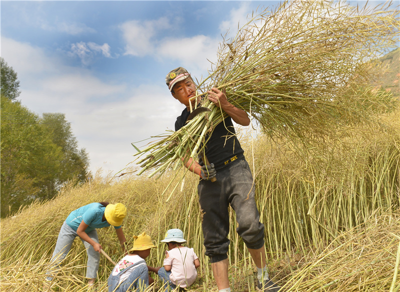 全家總動(dòng)員,收割油菜籽。李崇軒攝