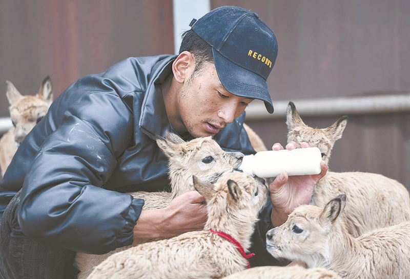 可可西里國家級自然保護(hù)區(qū)卓乃湖保護(hù)站的工作人員才文多杰在給藏羚羊幼仔喂奶(2020年7月7日攝)。新華社記者 薛玉斌 攝