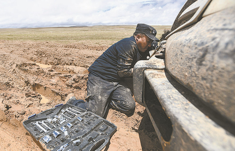 可可西里國家級自然保護(hù)區(qū)卓乃湖保護(hù)站站長秋培扎西在可可西里地區(qū)修理車輛(2020年7月6日攝)。新華社記者 薛玉斌 攝