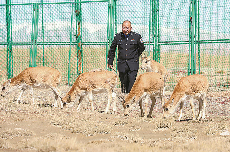 在可可西里國家級自然保護(hù)區(qū)索南達(dá)杰保護(hù)站,站長趙新錄與藏羚羊在一起(9月28日攝)。新華社記者 李占軼 攝
