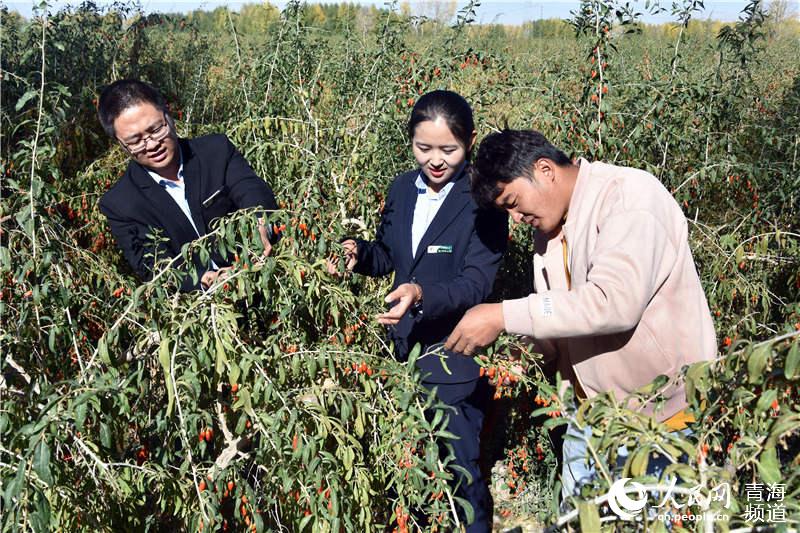 村民向中國郵政儲蓄銀行青海省分行工作人員展示枸杞豐收。趙悅攝