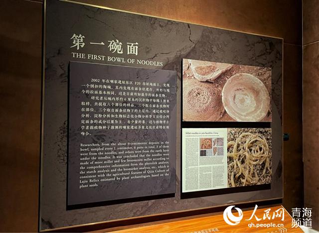 “這就是我們震驚世界的中華第一碗面!眻(chǎng)館工作人員介紹,2002年的冬天,青海考古隊(duì)在喇家遺址20號(hào)房址內(nèi)一個(gè)倒扣的陶碗內(nèi)發(fā)現(xiàn)的,經(jīng)過分析鑒定后發(fā)現(xiàn)面條的大量成分是粟,還有少量的黍,將這兩種糧食磨成粉,用水調(diào)和,擠壓的方式制作而成。并且在陶碗的泥土里發(fā)現(xiàn)了肉和調(diào)料的成分,說明那時(shí)已經(jīng)有了對(duì)美味的追求。