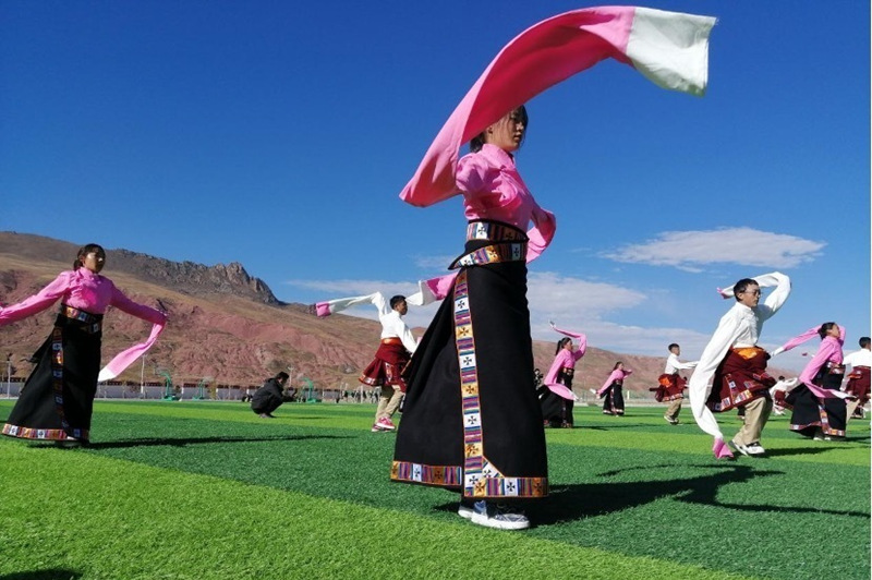 學(xué)生們?cè)谡n間跳起囊謙古舞——卓根瑪。劉成友攝