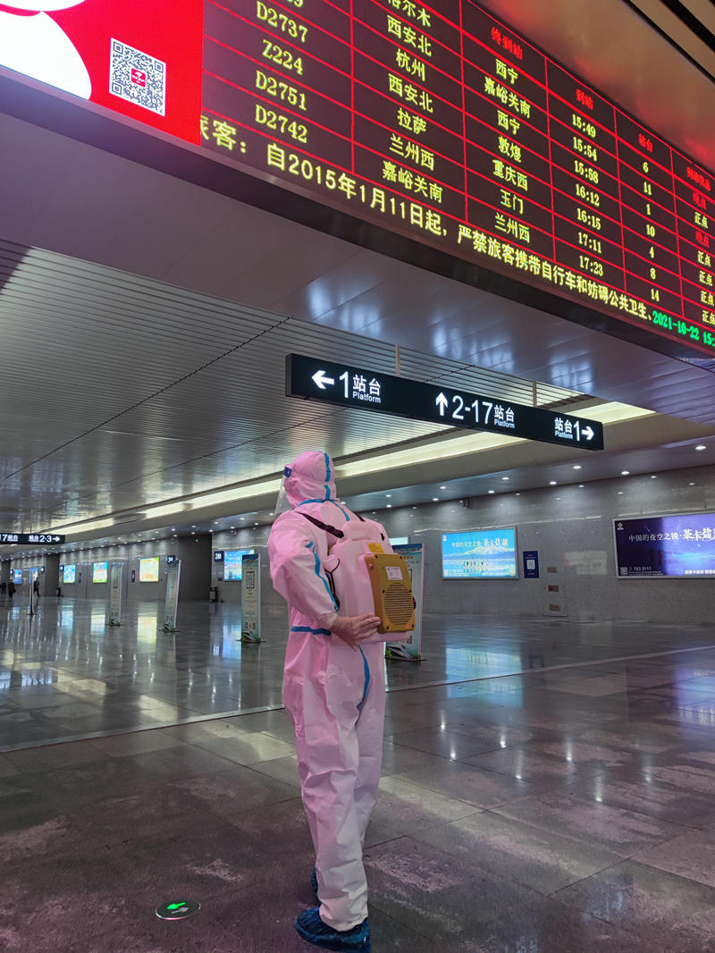 工作人員在候車大廳進(jìn)行消殺。青藏集團(tuán)公司供圖