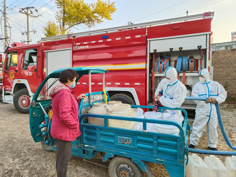由于道路改造、修建飲用水管網(wǎng),平安區(qū)東村村民生活用水受到嚴(yán)重影響,疫情發(fā)生后,東村認(rèn)真落實(shí)“里不出,外不進(jìn)”工作要求,嚴(yán)格實(shí)行居民出行管控,對(duì)村莊實(shí)施了封閉式管理。但“嚴(yán)防”之下,原本需要外出挑水的村民用水就成了難題。平安區(qū)消防救援大隊(duì)得知這一情況后,主動(dòng)靠前,保障民生,每?jī)商煺{(diào)派2輛消防車、10名指戰(zhàn)員向村內(nèi)進(jìn)行一次集中送水,堅(jiān)決保障居民生活用水充足。