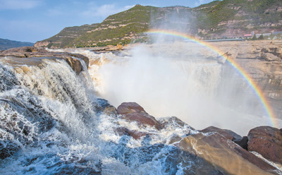 10月18日,黃河壺口景區(qū)出現(xiàn)彩虹飛瀑景致。當(dāng)日,藍(lán)天白云下的黃河壺口瀑布“群龍”戲瀑,彩虹臥波。人民視覺(jué)