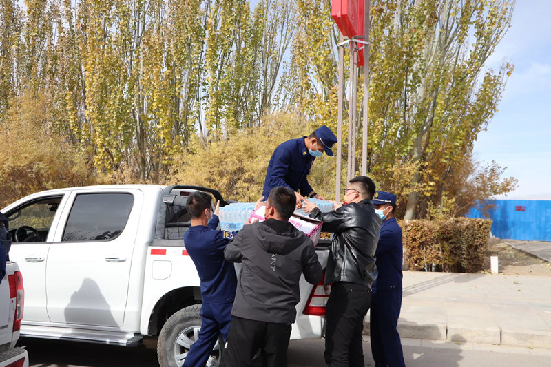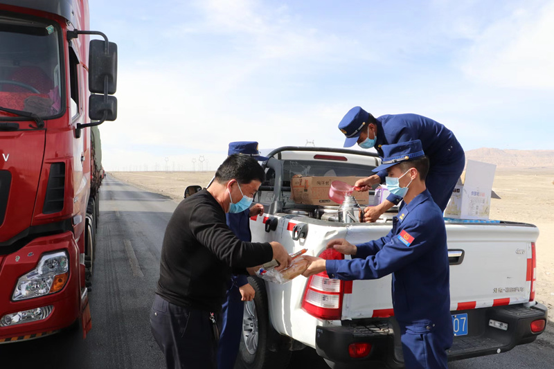 為積極落實(shí)疫情管控措施,茫崖地區(qū)加強(qiáng)了對(duì)過(guò)往車(chē)輛的排查,導(dǎo)致315國(guó)道出現(xiàn)車(chē)輛大面積人員、車(chē)輛滯留。茫崖市消防救援大隊(duì)得知消息后,迅速組織指戰(zhàn)員為滯留貨車(chē)司機(jī)免費(fèi)提供飯菜、面包和飲用水,用心用情讓滯留人員感受到“火焰藍(lán)”的溫暖。