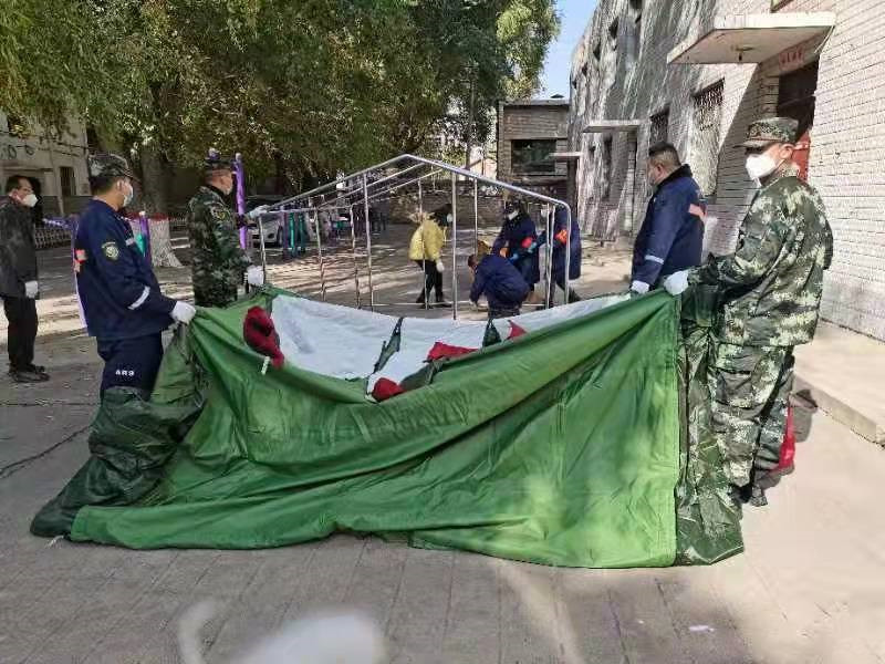 退役軍人志愿服務(wù)隊(duì)搭建帳篷。西寧市退役軍人事務(wù)局供圖