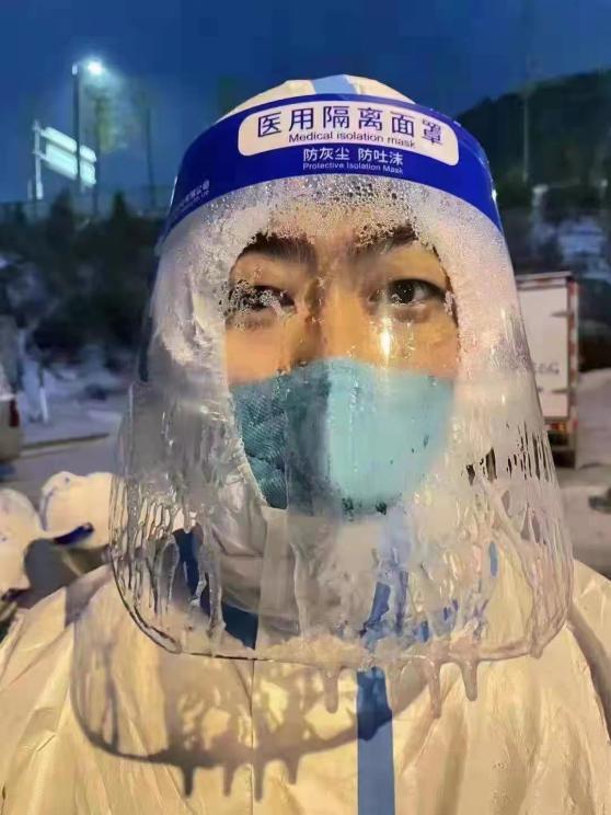 11月6日,初冬的西寧,氣溫驟降,雨雪交加,西寧市主城區(qū)第一輪全員核酸檢測首日采樣工作結束后,一張被網友稱為“西寧最美面孔”的照片傳遍了青海人的朋友圈。照片中,一名身穿防護服的醫(yī)生佩戴的醫(yī)用隔離面罩被哈氣、汗氣打濕,寒夜的低溫又將水汽冰封……這張照片的主人公叫陳浩。