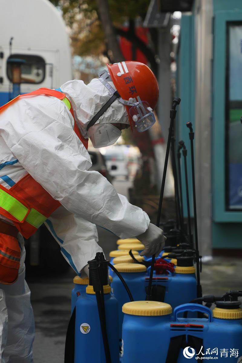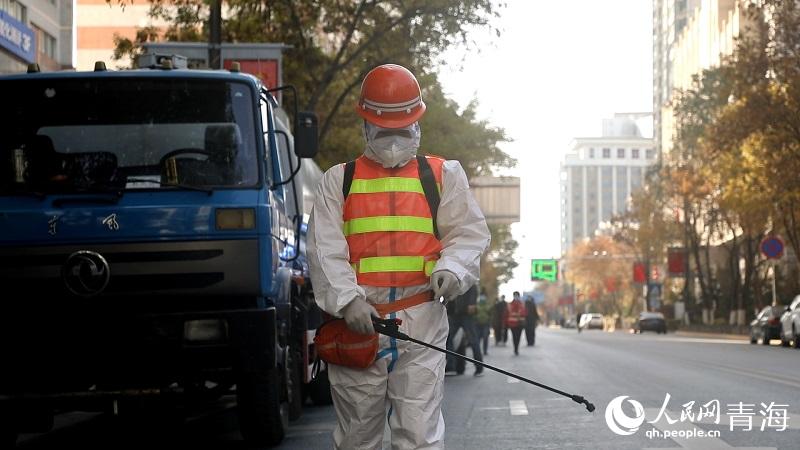 抗疫一線,匆忙的步伐并不少見。下午3點,李紅文正在西寧市城西區(qū)興海路口附近進行消殺,幾十米外便是此次疫情發(fā)生后最先劃定的管控區(qū)。