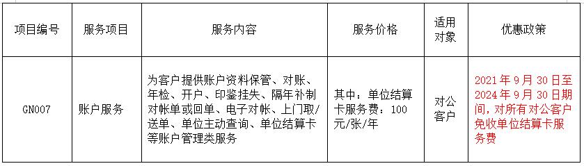 二、降低銀行賬戶服務(wù)收費(fèi),在前期已對所有對公客戶免收單位結(jié)算賬戶管理費(fèi)和年費(fèi)的基礎(chǔ)上,本次對所有對公客戶免收單位結(jié)算卡服務(wù)費(fèi),優(yōu)惠期限為3年。具體如下: