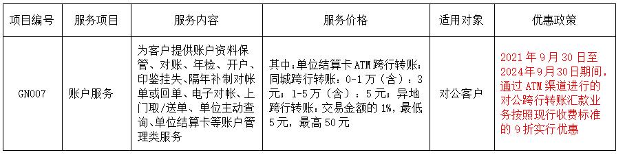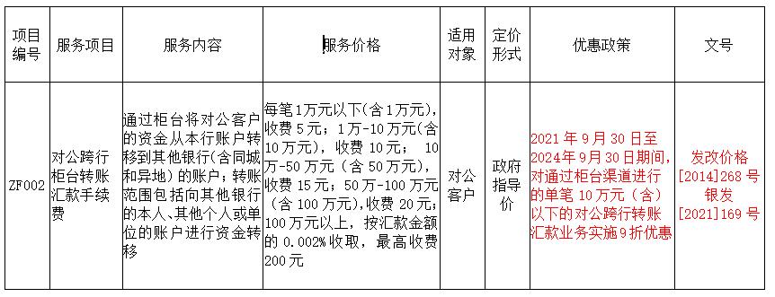 六、降低對公跨行轉(zhuǎn)賬匯款(網(wǎng)上銀行、手機(jī)銀行等渠道)手續(xù)費(fèi),對單筆10萬元(含)以內(nèi)的對公跨行轉(zhuǎn)賬匯款業(yè)務(wù)按照現(xiàn)行收費(fèi)標(biāo)準(zhǔn)的9折實(shí)行優(yōu)惠;降低對公本行異地轉(zhuǎn)賬匯款(柜臺渠道)手續(xù)費(fèi),單筆10萬元(含)以下的對公本行異地轉(zhuǎn)賬免收匯款手續(xù)費(fèi),優(yōu)惠期限為3年;對公網(wǎng)上銀行、手機(jī)銀行渠道本行轉(zhuǎn)賬繼續(xù)免收匯款手續(xù)費(fèi)。具體如下: