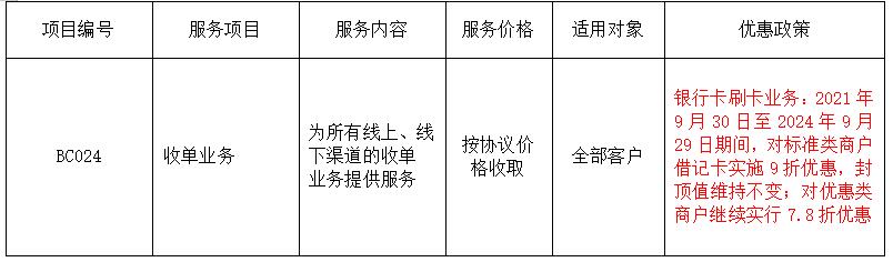 四、降低銀行卡刷卡手續(xù)費(fèi),對標(biāo)準(zhǔn)類商戶借記卡發(fā)卡行服務(wù)費(fèi)、網(wǎng)絡(luò)服務(wù)費(fèi)在現(xiàn)行政府指導(dǎo)價基礎(chǔ)上實(shí)行9折優(yōu)惠、封頂值維持不變,對優(yōu)惠類商戶發(fā)卡行服務(wù)費(fèi)、網(wǎng)絡(luò)服務(wù)費(fèi)繼續(xù)在現(xiàn)行政府指導(dǎo)價基礎(chǔ)上實(shí)行7.8折優(yōu)惠。中信銀行作為收單機(jī)構(gòu),同步降低對商戶的收單服務(wù)費(fèi),優(yōu)惠期限為3年。具體如下: