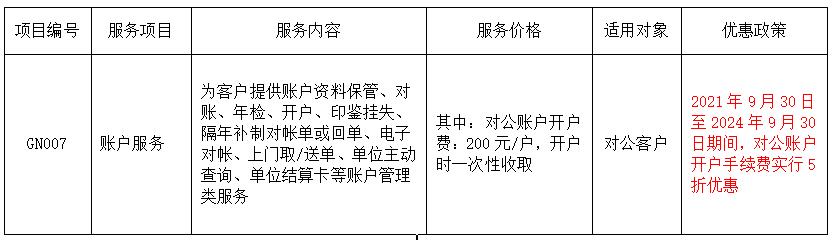 五、降低銀行賬戶開戶手續(xù)費(fèi),對所有對公客戶在中信銀行開立單位結(jié)算賬戶開戶手續(xù)費(fèi)實(shí)行5折優(yōu)惠,優(yōu)惠期限為3年。具體如下: