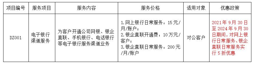八、降低對公網(wǎng)上銀行、銀企直聯(lián)服務(wù)費(fèi),對所有對公客戶實(shí)行5折優(yōu)惠,優(yōu)惠期限為3年。具體如下: