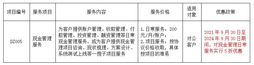 九、降低對公現(xiàn)金管理服務(wù)費(fèi),對所有對公客戶實(shí)行5折優(yōu)惠,優(yōu)惠期限為3年。具體如下: