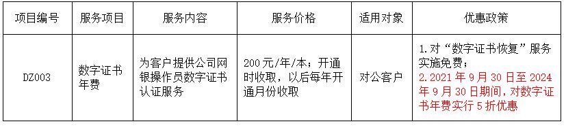 十、降低數(shù)字證書年費(fèi),對所有對公客戶實(shí)行5折優(yōu)惠,優(yōu)惠期限為3年。具體如下: