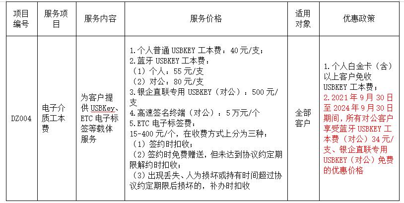 十一、降低對公安全認(rèn)證工具工本費(fèi),刪除普通對公USBKEY;藍(lán)牙USBKEY工本費(fèi),對所有對公客戶按成本價收取,銀企直聯(lián)專用USBKEY免費(fèi)向客戶提供,以上項目優(yōu)惠期限為3年。具體如下: