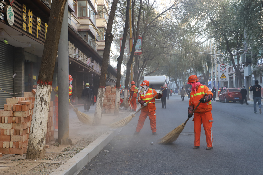 解封后,環(huán)衛(wèi)工人正在打掃衛(wèi)生。人民網(wǎng) 楊啟紅攝