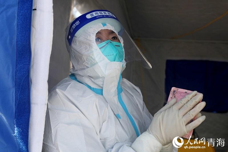 在西寧市城西區(qū)虎臺公園檢測點,一名身穿防護服的工作人員拿著喇叭,維持現(xiàn)場秩序!疤鞖膺@么冷,我給大家唱首歌好不好?”隊伍中傳出一聲好之后,這名工作人員便唱起了歌:“五星紅旗迎風飄揚,勝利歌聲多么響亮……”現(xiàn)場眾人也跟著大聲齊唱起來。