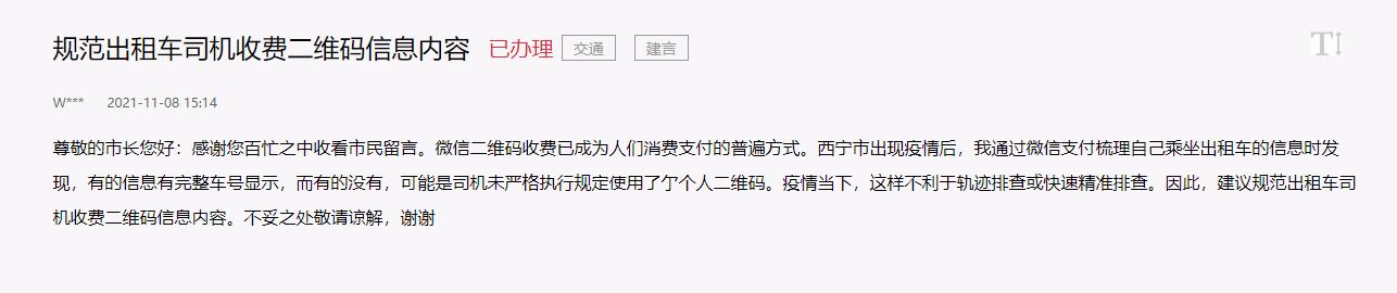“車輛信息不包含完整車號,這樣不利于疫情期間軌跡排查……”近日,有網(wǎng)友在人民網(wǎng)“領(lǐng)導(dǎo)留言板”青海版塊留言表示,他通過微信支付梳理乘坐過的出租車信息時(shí)發(fā)現(xiàn),有些信息包含完整車號,而有的不顯示,可能是司機(jī)未嚴(yán)格執(zhí)行規(guī)定,使用了個(gè)人收款二維碼。疫情當(dāng)下,這種情況不利于軌跡排查或快速精準(zhǔn)排查,該網(wǎng)友建議規(guī)范出租車收費(fèi)二維碼信息內(nèi)容。