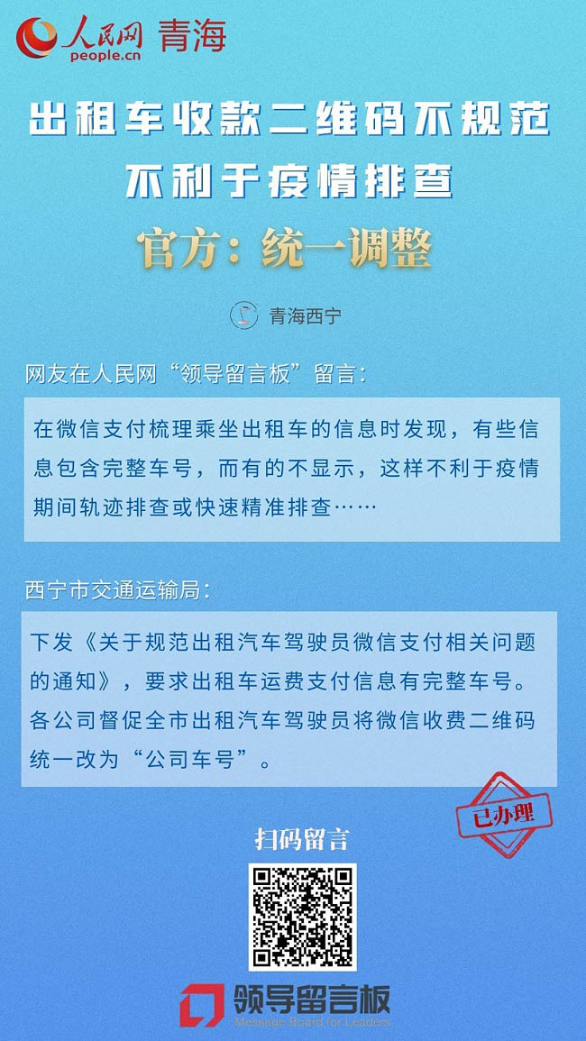 對此,西寧市交通運(yùn)輸局回復(fù):經(jīng)核實(shí),相關(guān)單位收到意見建議后,立即對出租汽車“二維碼收款”問題進(jìn)行分析,下發(fā)《關(guān)于規(guī)范出租汽車駕駛員微信支付相關(guān)問題的通知》,出租車運(yùn)費(fèi)支付信息有完整車號,不但在疫情期間便于查找乘車軌跡,而且便于乘客查找失物、處理服務(wù)投訴等。要求各公司督促全市出租汽車駕駛員將微信收費(fèi)二維碼統(tǒng)一改為“公司車號”,如“瑞達(dá)青ATXXXX”。