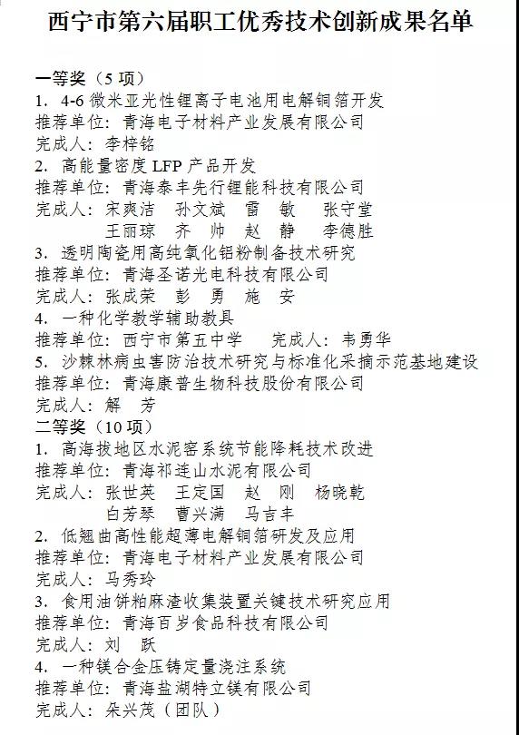 西寧市第六屆職工優(yōu)秀技術(shù)創(chuàng)新成果評選結(jié)果揭曉