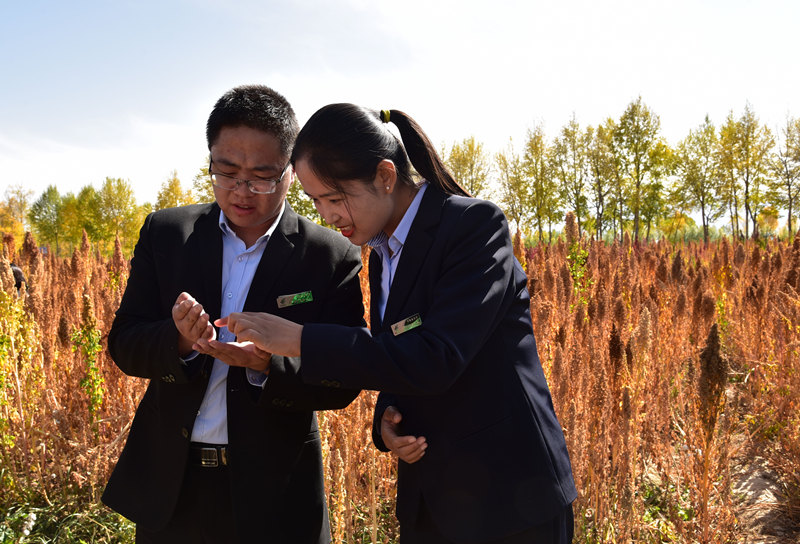 郵政儲蓄銀行烏蘭縣“雙基聯(lián)動”辦公室工作人員也沉浸在藜麥豐收的喜悅中。朱集社攝