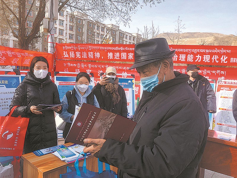 活動(dòng)現(xiàn)場(chǎng),省司法廳、黃南州、同仁市等相關(guān)部門(mén)負(fù)責(zé)人向15支法治宣講隊(duì)授旗,并為群眾代表贈(zèng)送藏漢雙語(yǔ)的憲法、民法典、地方自治條例、民族團(tuán)結(jié)進(jìn)步條例、城鎮(zhèn)市容和環(huán)境衛(wèi)生管理?xiàng)l例方面的書(shū)籍。宣傳活動(dòng)通過(guò)擺放展板、懸掛橫幅、發(fā)放普法書(shū)籍和法治宣傳冊(cè)(宣傳單)以及各類(lèi)普法宣傳品、為群眾現(xiàn)場(chǎng)提供法律咨詢(xún)服務(wù)、廣場(chǎng)大屏幕滾動(dòng)播放《“我和憲法”微電影》《黃南州“七五”普法專(zhuān)題片》等方式,普及憲法、法律知識(shí),弘揚(yáng)憲法精神。據(jù)統(tǒng)計(jì),當(dāng)日的宣傳活動(dòng)共展示展板1300塊、懸掛橫幅700余條、發(fā)放憲法、民法典、社區(qū)矯正法等書(shū)籍8萬(wàn)本、發(fā)放以憲法主題為主的各類(lèi)宣傳冊(cè)、宣傳單等12萬(wàn)份,接受法律咨詢(xún)80余人次。