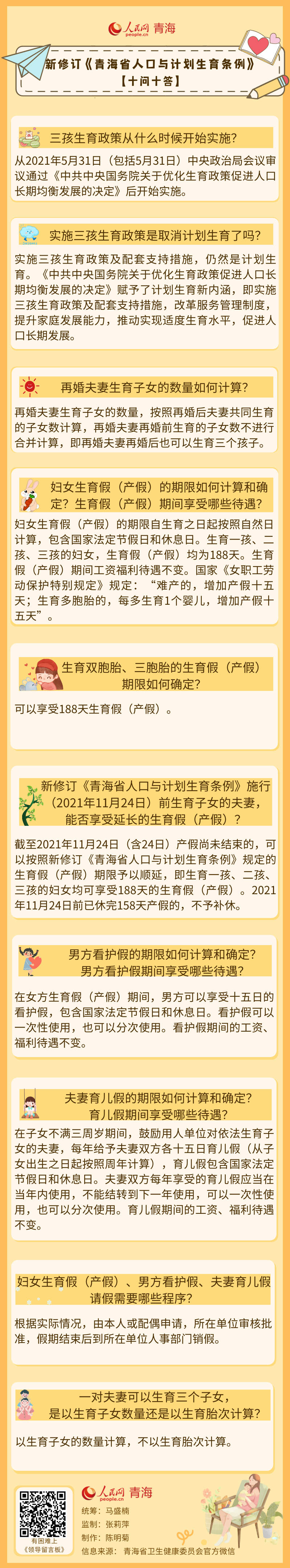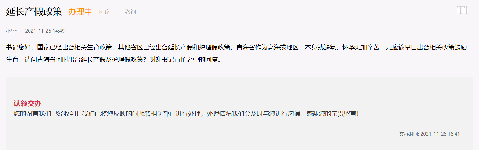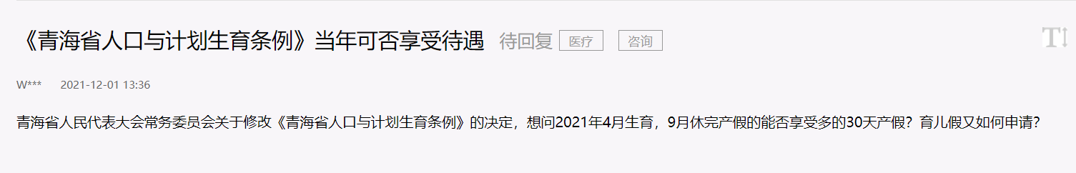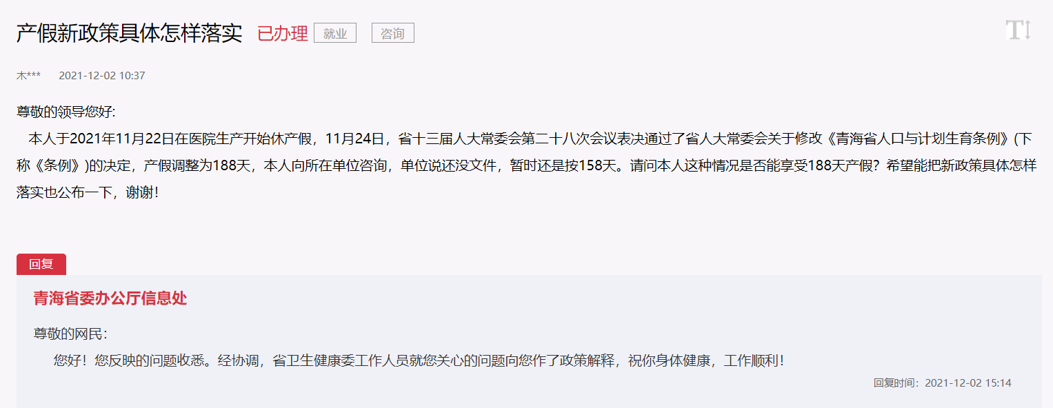 近日,不少網(wǎng)友在人民網(wǎng)“領(lǐng)導(dǎo)留言板”留言咨詢關(guān)于《青海省人口與計(jì)劃生育》條例的相關(guān)問(wèn)題,包括但不限于“青海省何時(shí)出臺(tái)延長(zhǎng)產(chǎn)假政策?”“188天的產(chǎn)假只適用于三孩媽媽嗎?”等問(wèn)題。實(shí)際上,2021年11月30日起,最新修改的《青海省人口與計(jì)劃生育條例》(以下簡(jiǎn)稱《條例》)已開(kāi)始施行,上述問(wèn)題在《條例》中有說(shuō)明。
