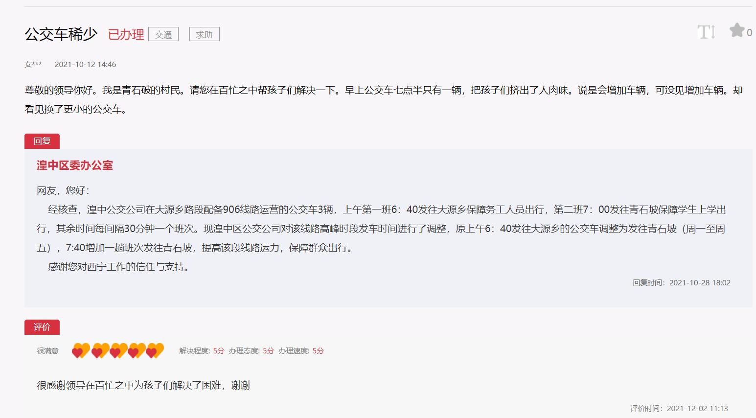 隨后,西寧市湟中區(qū)委辦公室對(duì)此事作出回復(fù):原上午6:40發(fā)往大源鄉(xiāng)的公交車調(diào)整為發(fā)往青石坡(周一至周五),7:40增加一趟班次發(fā)往青石坡,提高該段線路運(yùn)力,保障群眾出行。也就是說(shuō),原來(lái)該村7:30左右只有一班公交車,調(diào)整后,7:00~8:00時(shí)段,有兩班公交車(據(jù)留言網(wǎng)友本人反饋,一班7:10到青石坡,一班7:30左右到青石坡。)發(fā)往該村,有效緩解了學(xué)生及其余村民的出行難題。