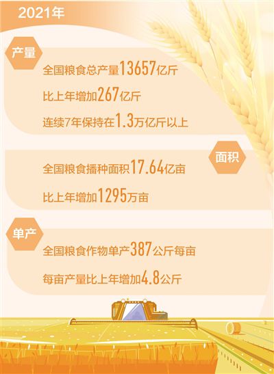 開局之年倉廩足。12月6日,國家統(tǒng)計(jì)局公布全國糧食生產(chǎn)數(shù)據(jù)顯示:2021年全國糧食總產(chǎn)量13657億斤,比上年增加267億斤,增長2.0%,全年糧食產(chǎn)量再創(chuàng)新高,連續(xù)7年保持在1.3萬億斤以上。糧食生產(chǎn)喜獲十八連豐。
