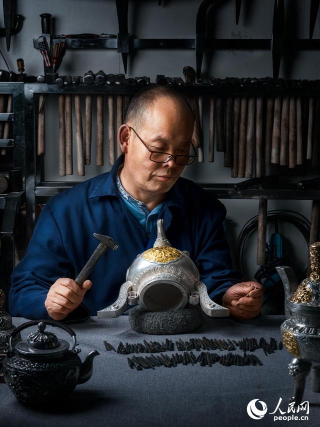 國家級非物質(zhì)文化遺產(chǎn),湟中銀銅器制作與鎏金技藝代表性傳承人何滿。人民網(wǎng) 雷陽攝