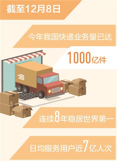 本報北京12月8日電 (記者李心萍)12月8日,國家郵政局快遞大數(shù)據(jù)平臺實(shí)時監(jiān)測數(shù)據(jù)顯示:今年我國快遞業(yè)務(wù)量已達(dá)1000億件,這是我國快遞年業(yè)務(wù)量首次超1000億件,標(biāo)志著郵政快遞業(yè)發(fā)展又邁上了一個新臺階。近年來,郵政快遞業(yè)持續(xù)抓重點(diǎn)、補(bǔ)短板、強(qiáng)弱項(xiàng),產(chǎn)業(yè)融合日趨緊密,市場活力全面迸發(fā),行業(yè)發(fā)展取得了長足的進(jìn)步。