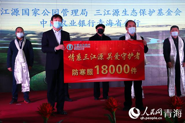 人民網(wǎng)西寧12月9日電 (楊啟紅)12月9日,三江源國(guó)家公園管理局、三江源生態(tài)保護(hù)基金會(huì)聯(lián)合中國(guó)農(nóng)業(yè)銀行青海省分行舉辦“情系三江源 關(guān)愛(ài)守護(hù)者”金融支持三江源國(guó)家公園建設(shè)公益捐贈(zèng)活動(dòng)。農(nóng)業(yè)銀行青海省分行為三江源一線生態(tài)管護(hù)員捐贈(zèng)18000件防寒服,價(jià)值1000萬(wàn)元,以實(shí)際行動(dòng)幫助生態(tài)管護(hù)員們解決困難。