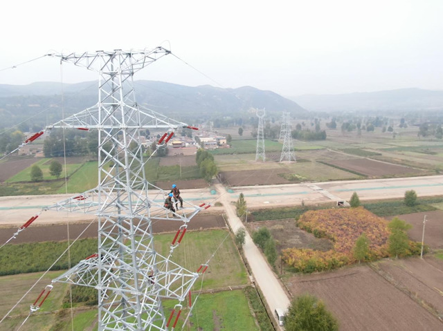 國網(wǎng)西寧供電公司工作人員在旱臺(新寨)110千伏輸變電工程線路跨越施工。劉玉斌攝