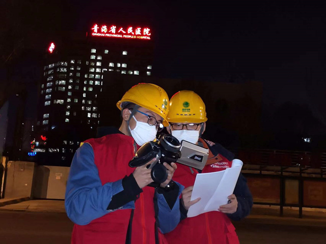 國網(wǎng)青海電力三江源(西寧電靚夏都)共產(chǎn)黨員服務隊隊員在疫情防控期間為省醫(yī)院供電線路測溫。劉玉斌攝