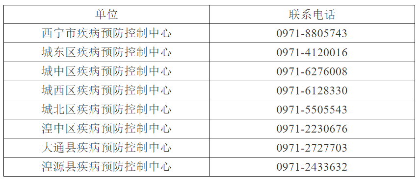 附表:西寧市及各縣區(qū)疾病預(yù)防控制中心電話: