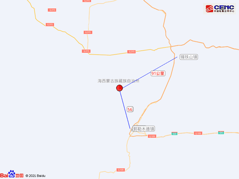 此次地震,震中距格爾木市62公里、距大柴旦行政委員會121公里、距德令哈市244公里、距甘肅肅北蒙古族自治縣289公里,距海西蒙古族藏族自治州245公里,距西寧市635公里。震中5公里范圍內(nèi)平均海拔約2686米。