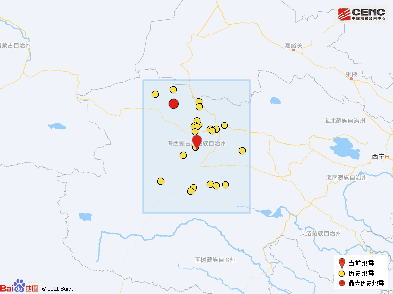 根據(jù)中國地震臺網(wǎng)速報目錄,震中周邊200公里內(nèi)近5年來發(fā)生3級以上地震共26次,最大地震是2021年6月16日在青海海西州茫崖市發(fā)生的5.8級地震(距離本次震中156公里),歷史地震分布如圖。