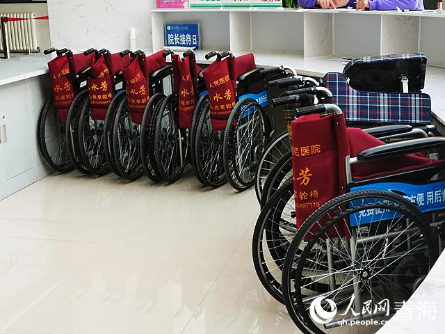 醫(yī)院大廳,放著一排印有陳水芳手機號的輪椅,“一共20把,都是我們陳院長自費買的!睂г\臺的護士告訴記者們。這還要從陳水芳剛來海西州人民醫(yī)院開展援青工作的時候說起。