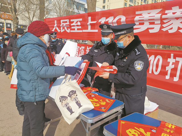 民警向群眾發(fā)放“110”宣傳品。青海省公安廳供圖