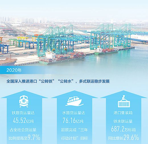 多式聯(lián)運(yùn)穩(wěn)步發(fā)展。鐵水聯(lián)運(yùn)、公鐵聯(lián)運(yùn)、空鐵聯(lián)運(yùn)、江海聯(lián)運(yùn)等運(yùn)輸組織模式創(chuàng)新發(fā)展,2020年,全國港口完成集裝箱鐵水聯(lián)運(yùn)量687.2萬標(biāo)箱,同比增長29.6%。