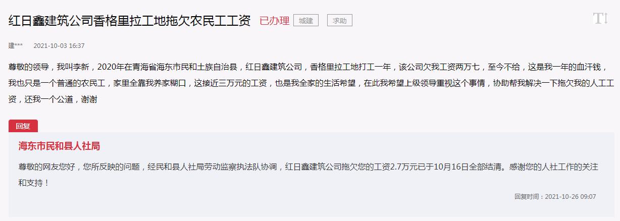 隨后,青海省海東市民和縣人社局回復(fù)該網(wǎng)友稱:經(jīng)民和縣人社局勞動監(jiān)察執(zhí)法隊協(xié)調(diào),紅日鑫建筑公司拖欠工資2.7萬元已于10月16日全部結(jié)清。該網(wǎng)友也通過留言表示,拖欠工資已結(jié)清。