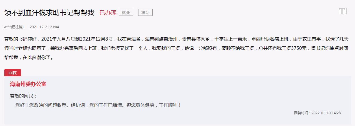 收到留言后,海南州委辦公室協(xié)調(diào)相關(guān)部門解決了此事,并回復(fù):“經(jīng)協(xié)調(diào),您的工資已結(jié)清!