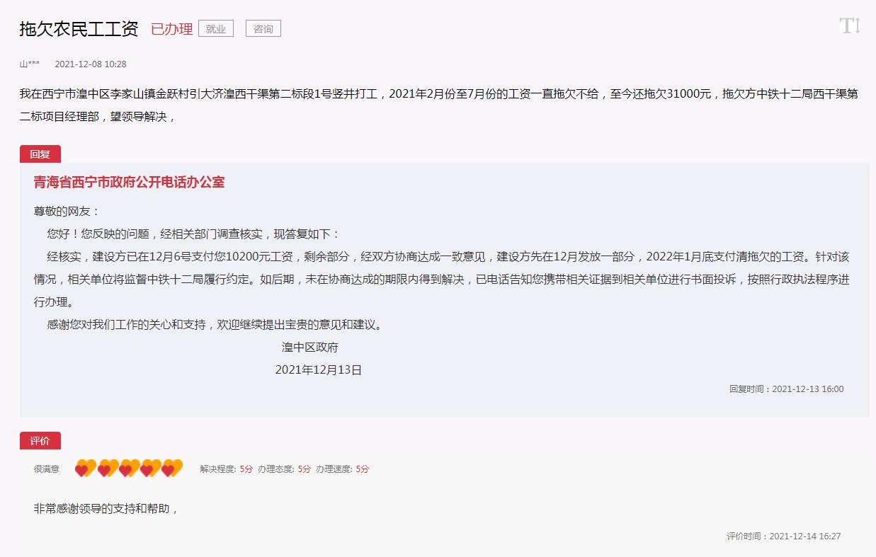 青海省西寧市政府公開電話辦公室回復(fù),經(jīng)核實,建設(shè)方已在12月6號支付您10200元工資,剩余部分,經(jīng)雙方協(xié)商達成一致意見,建設(shè)方先在12月發(fā)放一部分,2022年1月底支付清拖欠的工資。針對該情況,相關(guān)單位將監(jiān)督中鐵十二局履行約定。如后期,未在協(xié)商達成的期限內(nèi)得到解決,已電話告知您攜帶相關(guān)證據(jù)到相關(guān)單位進行書面投訴,按照行政執(zhí)法程序進行辦理。隨后,該網(wǎng)友也作出滿意回復(fù)。